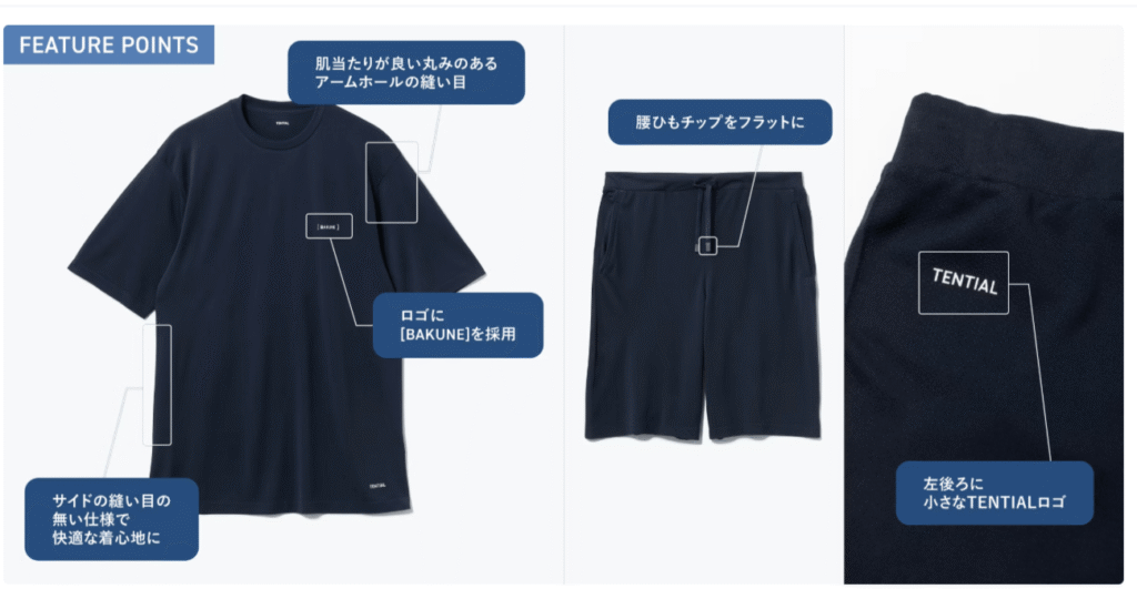 BAKUNEには「SELFLAME®」という8種のセラミックを生地に練り込んだ特殊素材が使われており、血行を促進することで疲労回復・疲労軽減が期待できます。
